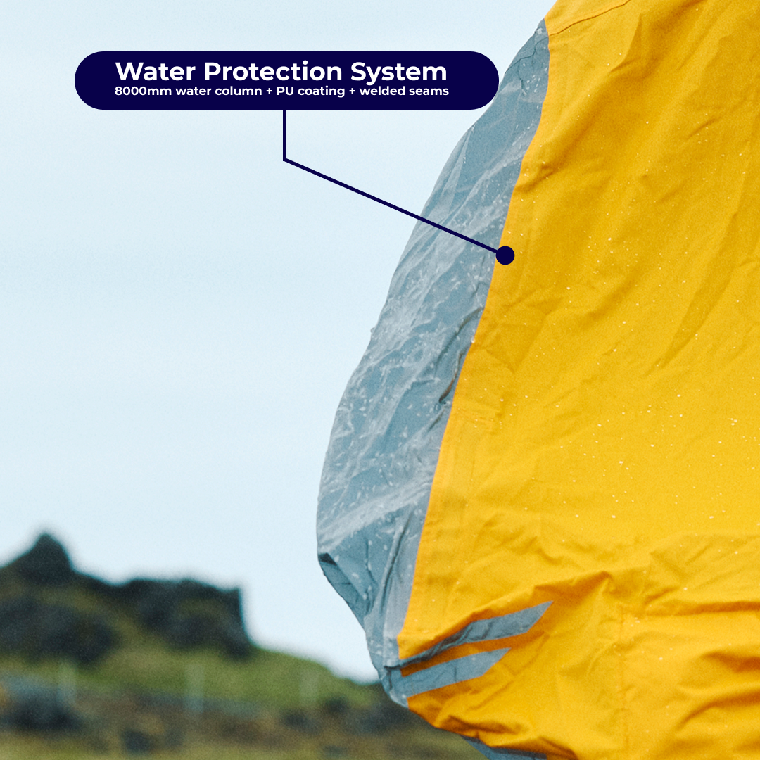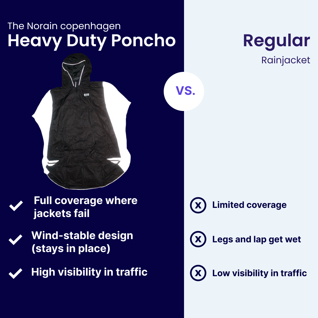 The poncho has welded seams and PU coating, strong enough for heavy and sustained rain. The long front panel keeps your thighs and lap dry while riding. (Your shoes may still get splash from the road, this is normal on any bike)