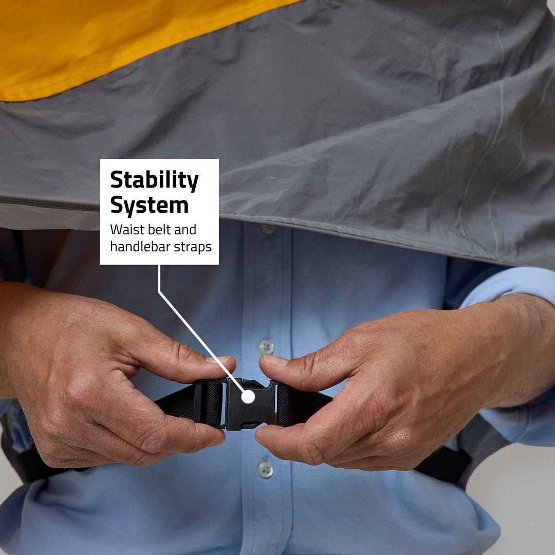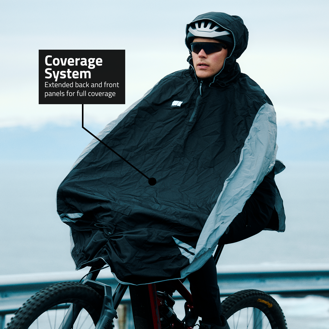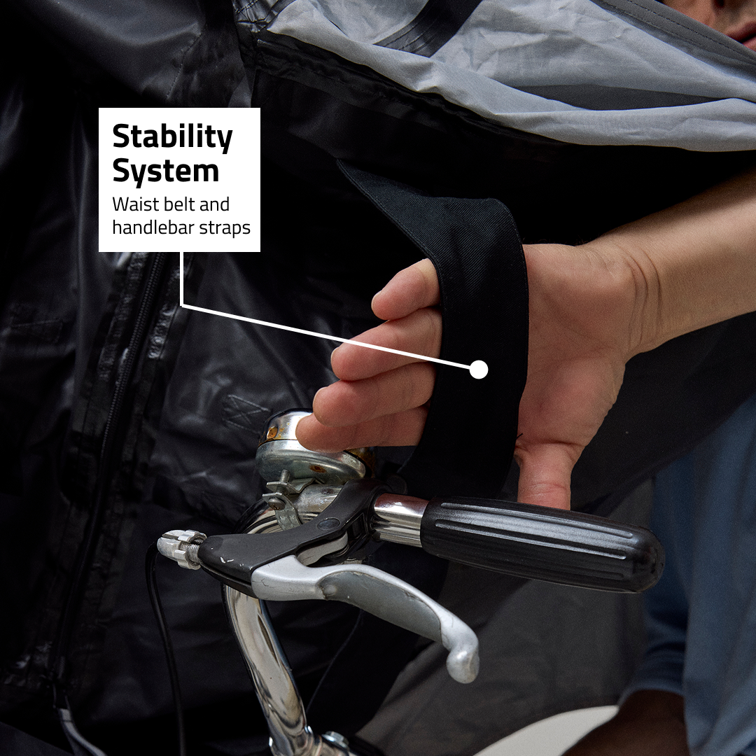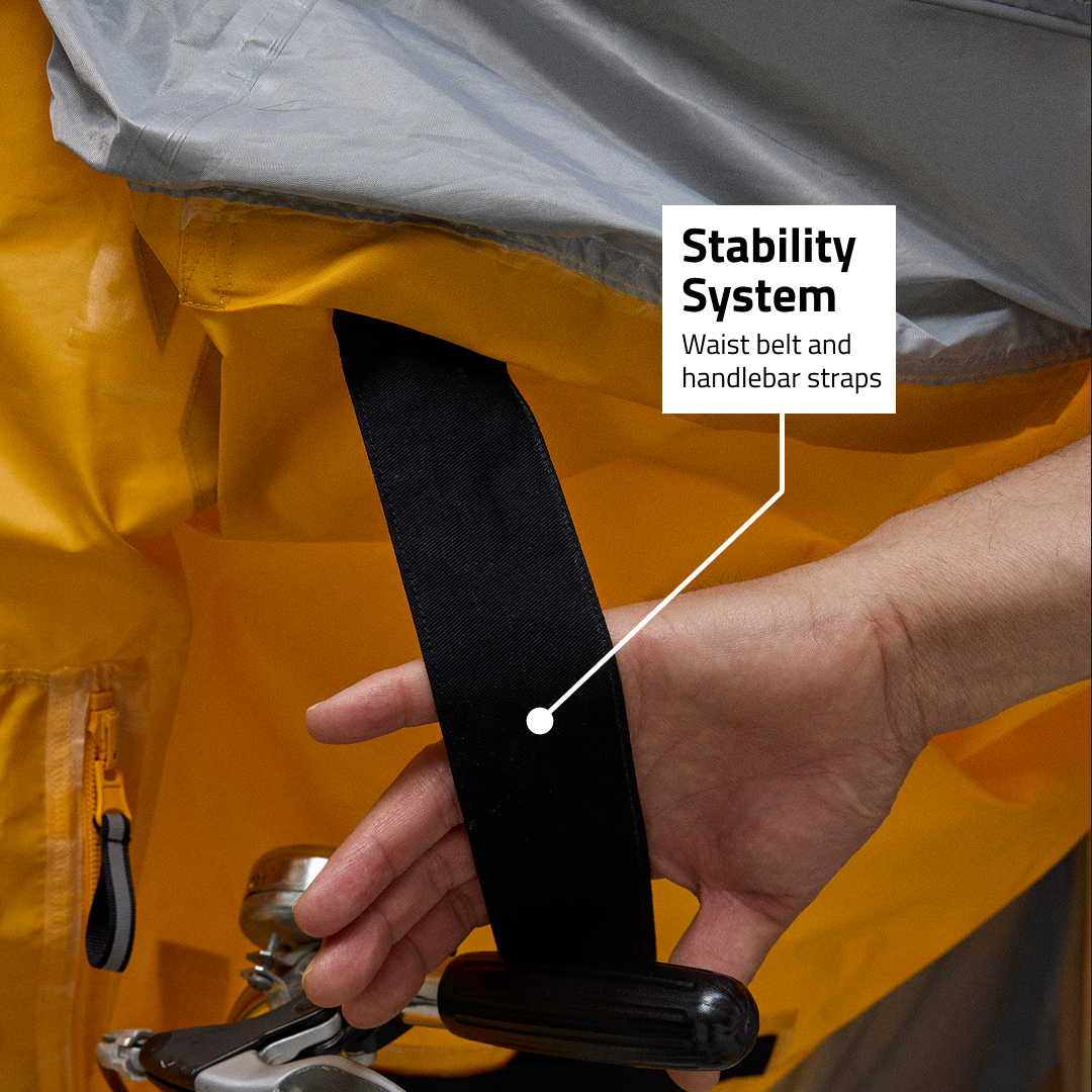 No. The built-in hand loops and adjustable waist belt keep the poncho close to your body, even on windy days or downhill. For extra stability, the poncho version also includes handlebar straps that secure the front for a calm, controlled ride.