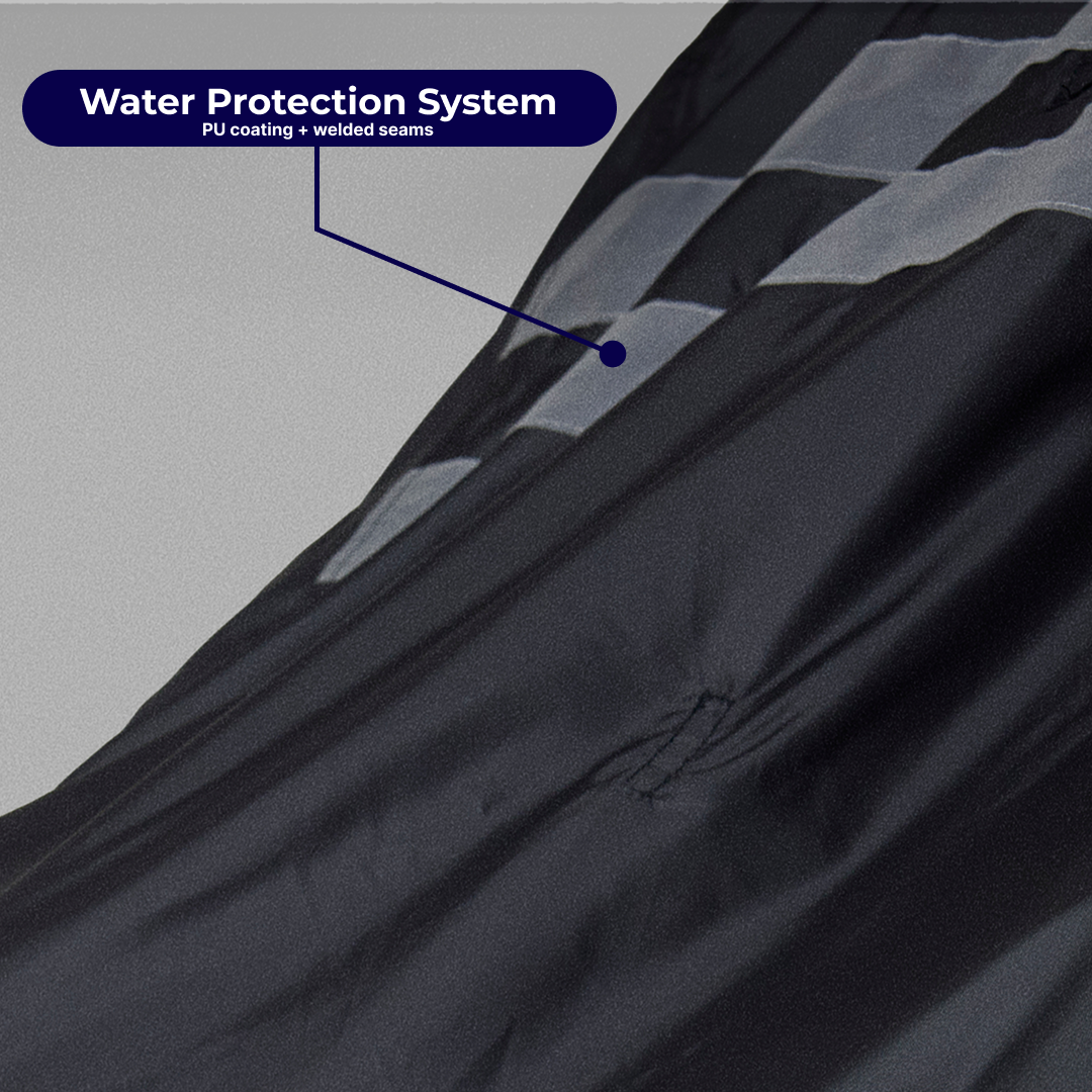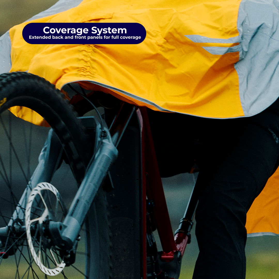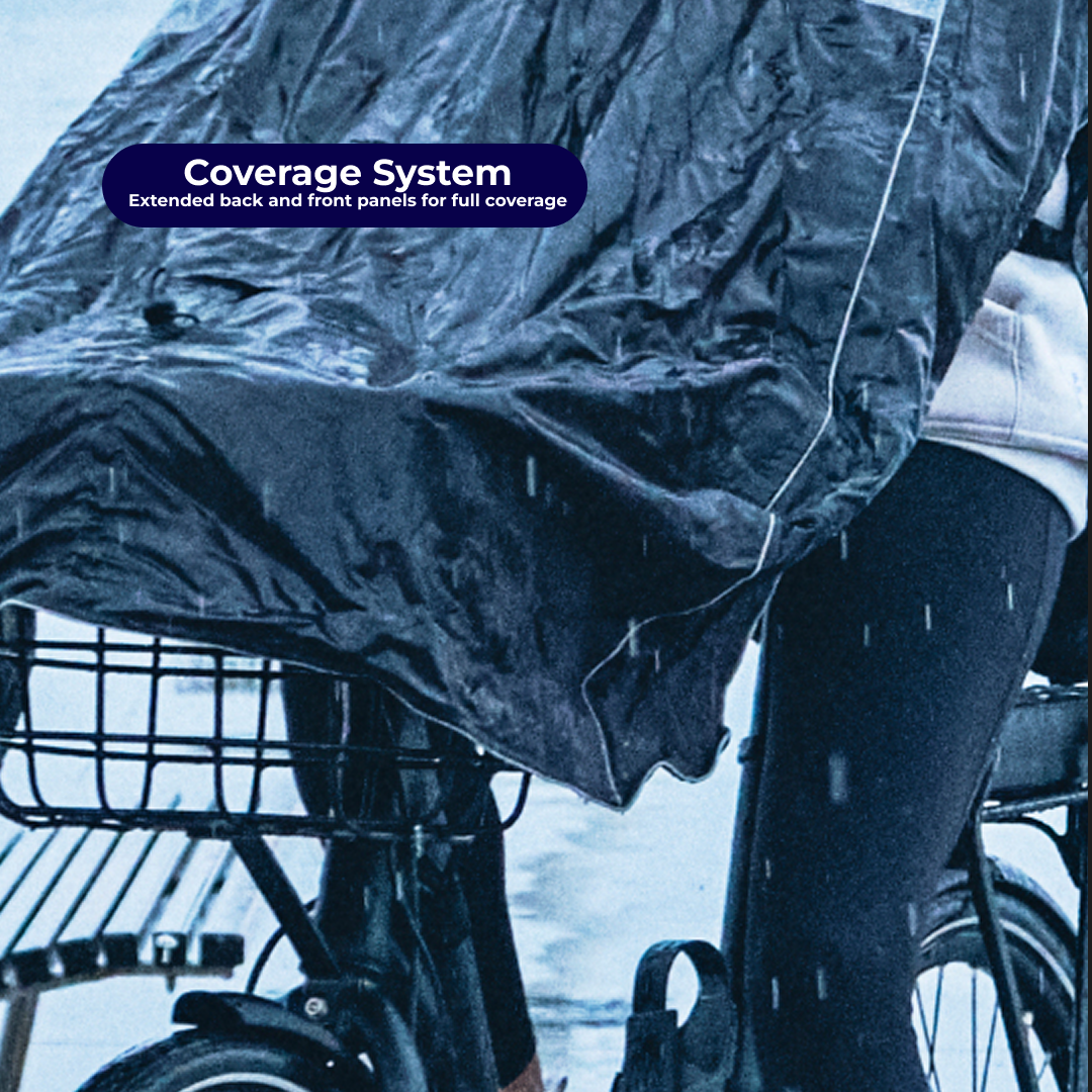 The poncho has welded seams and PU coating, strong enough for heavy and sustained rain. The long front panel keeps your thighs and lap dry while riding. (Your shoes may still get splash from the road, this is normal on any bike)