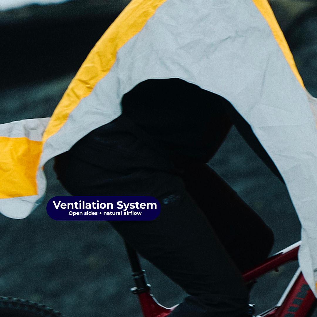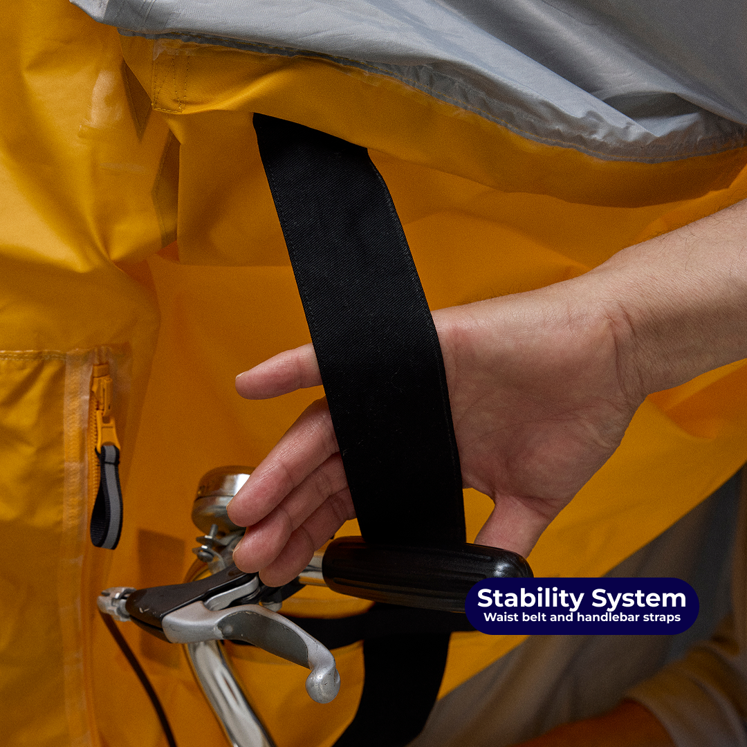 No. The built-in hand loops and adjustable waist belt keep the poncho close to your body, even on windy days or downhill. For extra stability, the poncho version also includes handlebar straps that secure the front for a calm, controlled ride.