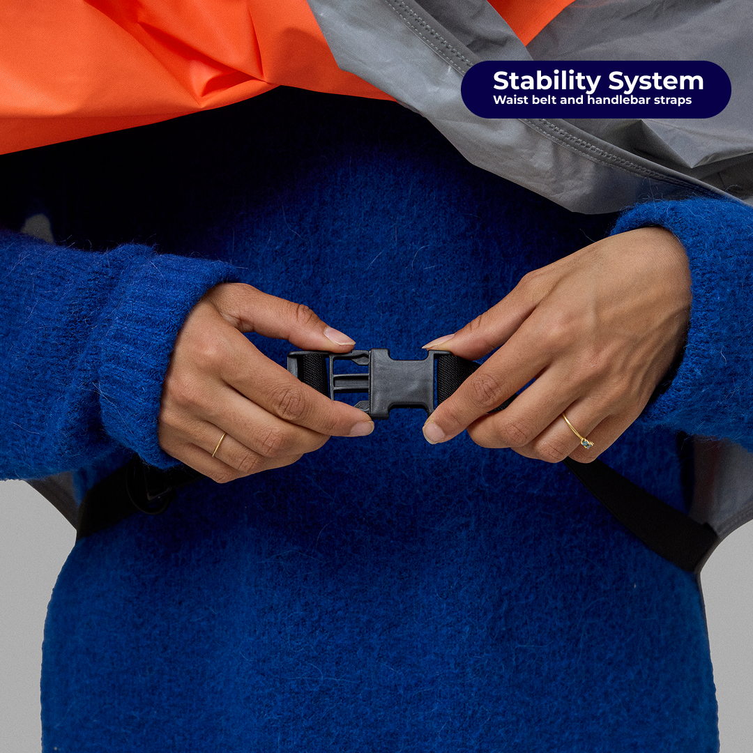 Built-in hand loops and a waist belt keep the poncho close to your body, so it doesn’t flap, even on windy rides or downhill.
