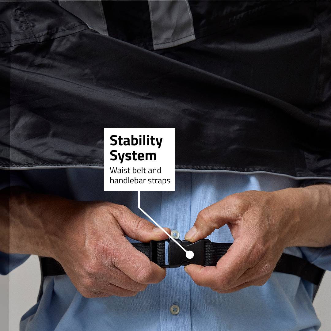 Indbyggede håndstropper og et bælte holder ponchoen tæt ind til kroppen, så den ikke blafrer, selv på blæsende ture eller ned ad bakke.