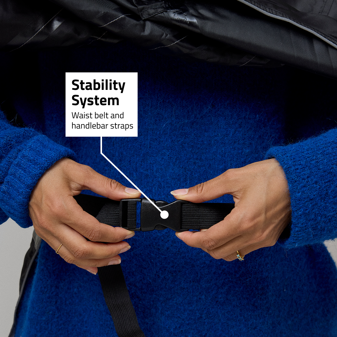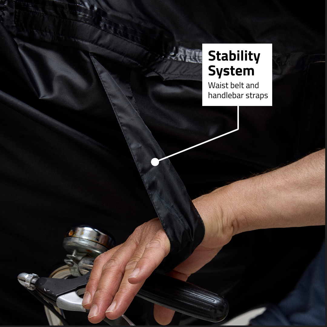 No. The built-in hand loops and adjustable waist belt keep the poncho close to your body, even on windy days or downhill. For extra stability, the poncho version also includes handlebar straps that secure the front for a calm, controlled ride.